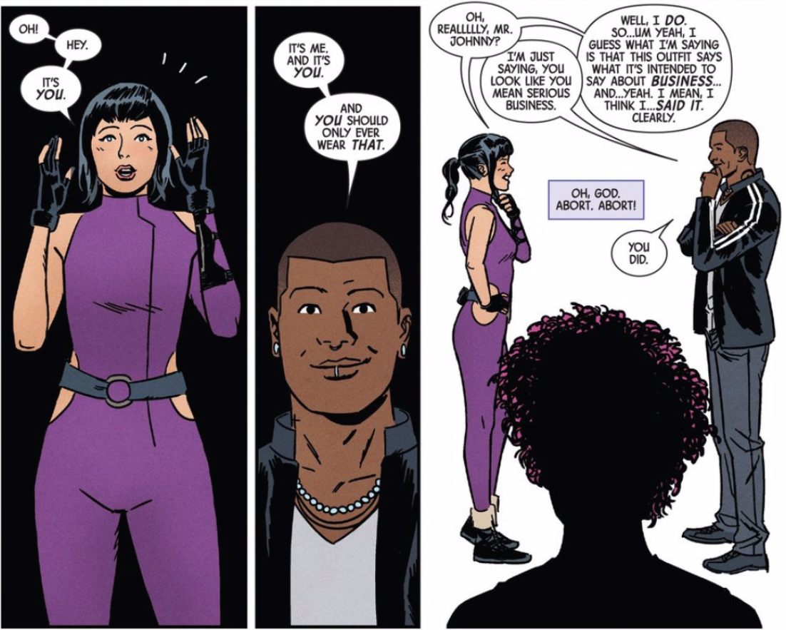 Of course, flirting, like detective work, is a decidedly different skill from superheroing, so while Kate’s swagger lets her pull of a one-sleeved purple catsuit, it doesn’t necessarily make her great at accepting compliments regarding that catsuit. It’s a great little microcosm of what this series is: she’s an expert at some things, but an absolute klutz at others. I think that’s something we can all relate to, even if our area of expertise isn’t quite as badass as Kate’s.
