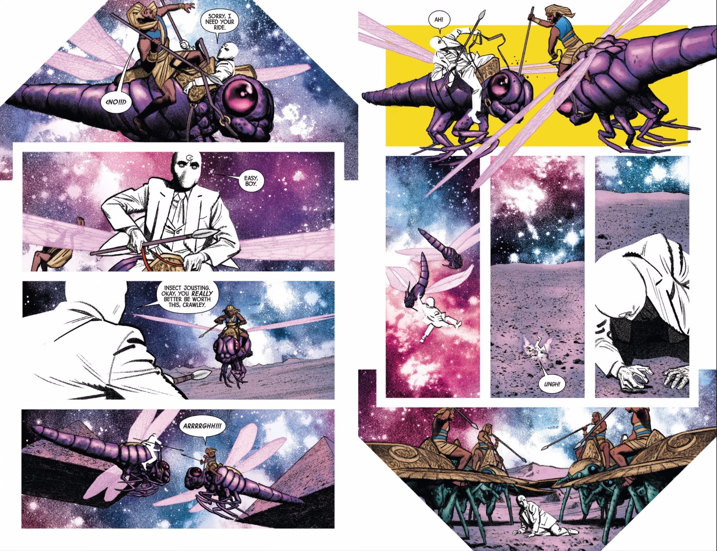 This scattershot of narrative would not be able to breathe without artist Greg Smallwood’s ability to make choices about the somewhat nonsensical reality of the Othervoid and excellent choices with page composition. The page composition, in particular, works beautifully and thematically. Just look at how he renders this absurd action scene of dragonfly jousting: