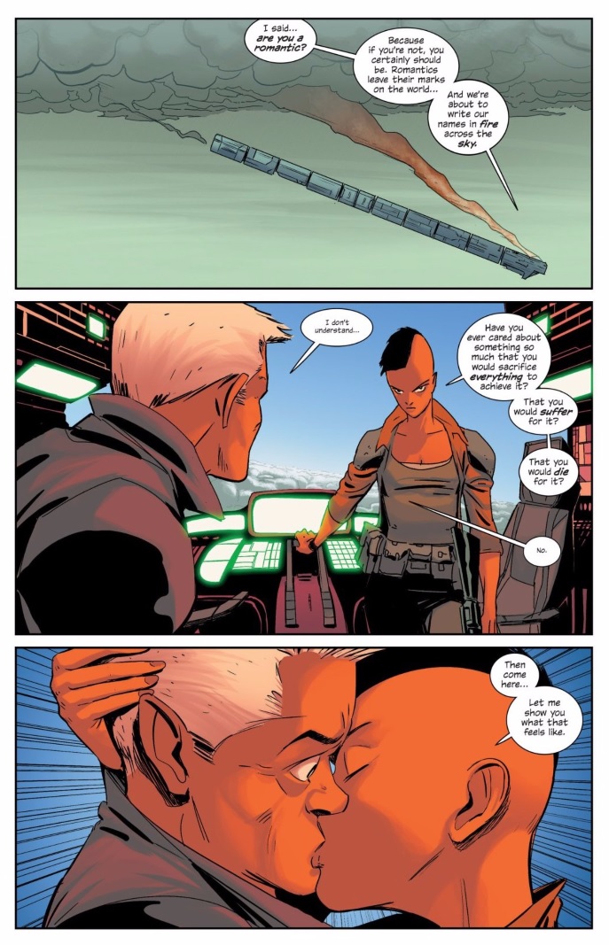“Are you a romantic?” she asks, as she plummets the grav-train towards the white tower, and I was reminded of a sublime quote by F. Scott Fitzgerald: “…the sentimental person thinks things will last — the romantic person has a desperate confidence that they won’t.” While this fits perfectly with the woman about to give her life for her cause in an act of guerilla warfare (as Patrick said, a very tricky notion to navigate in our current geo-political climate), and also plays off of LeVay’s toast to Doma to celebrate the weapons delivery, I thought the quote to be quite relevant to the dynamics of the series as a whole. The main two groups in the title are, of course, pro- or anti-apocalypse, a group looking to wipe the slate clean versus one trying to hold on to the flawed world they have now. Older characters like LeVay and Archibald then become interesting studies, because though they are “Chosen” and helping move the machinery of the End of Days, they are also the two characters most prone to wax on about the good ol’ days. Anyway, I hope the next issue starts off with that soldier in the page I posted having his life flash before his eyes. I want to know that man; I really do.