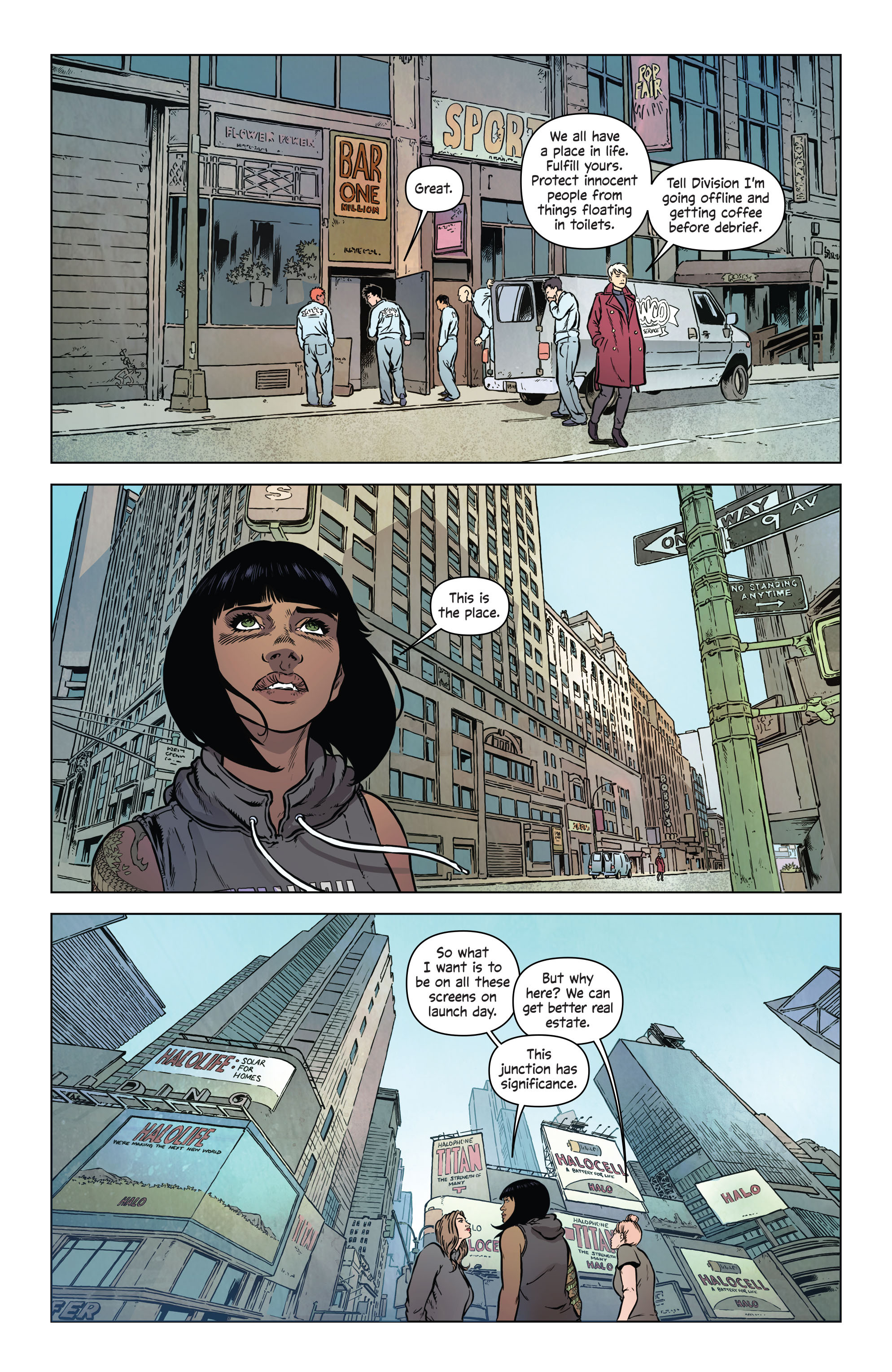 One thing that impressed me about The Wild Storm 1 is how Warren Ellis and Jon Davis-Hunt introduce characters in the book. The issue focuses on a specific character for a few pages before handing off the torch to another character who is within earshot. We open with Zealot wiping herself clean of blood and leaving a crime scene as she announces she’s getting coffee. Less than a block away Zealot and Pris are remarking on the streets of Manhattan as we are semi-introduced to HALO CEO Jacob Marlowe via TV screen. Zealot and Pris walk right past Miles Craven and his husband Julian, who avoid their gaze but cannot avoid the rantings and ravings of Angie Spica. Before doing her transformation act and saving Marlowe, she storms off right past the coffee shop where Zealot went to.