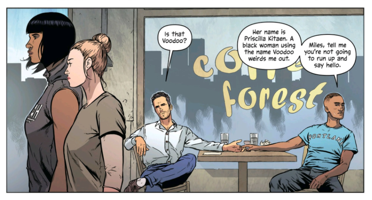 Not only is this a fun way to introduce us to the world of The Wild Storm, this coincidental, physical “six degrees of separation” storytelling seems to be in the DNA of the book itself. Jacob Marlowe remarks on how he nearly died but was saved by a metal lady — someone who very literally crossed his path and changed his life. Miles Craven comments on the idea of coincidental run-ins a couple of times in the book. The first time is when he is trying to avoid detection from Voodoo and Pris — one of my favorite past times — and the second is when he recognizes Angie Spica on the viewscreen at the end of the issue.