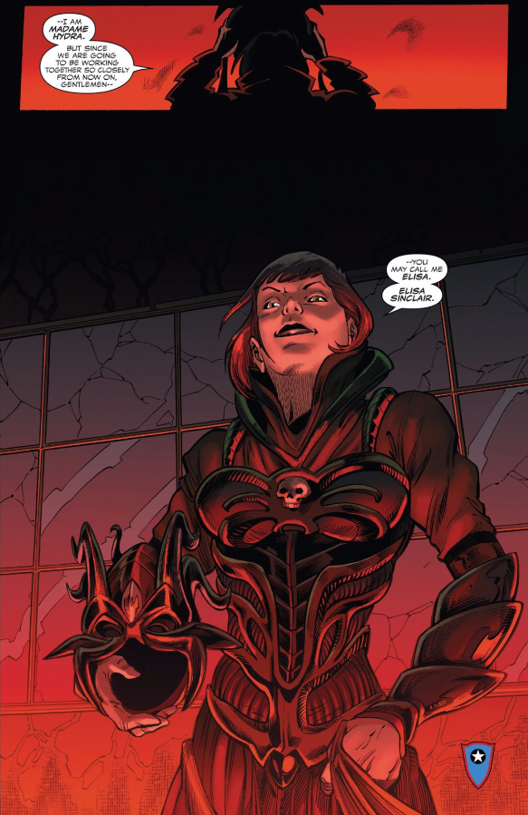 Regardless, I do think that Kobik has altered reality outside of Steve’s memories in at least one way. Steve’s flashbacks largely take familiar Captain America characters — Zola, Erskine, both Zemos — and recast them in new roles, but there’s one character who is original to Steve’s flashbacks: Elisa Sinclair. Nick Spencer created Elisa as figure who would introduce Hydra’s teachings to a young Steve Rogers, and I have a feeling that that’s exactly what happened in-universe as well: my theory is that Kobik created Elisa herself, as an almost self-insert figure who would introduce Steve to Kobik’s interpretation of Hydra’s teachings.