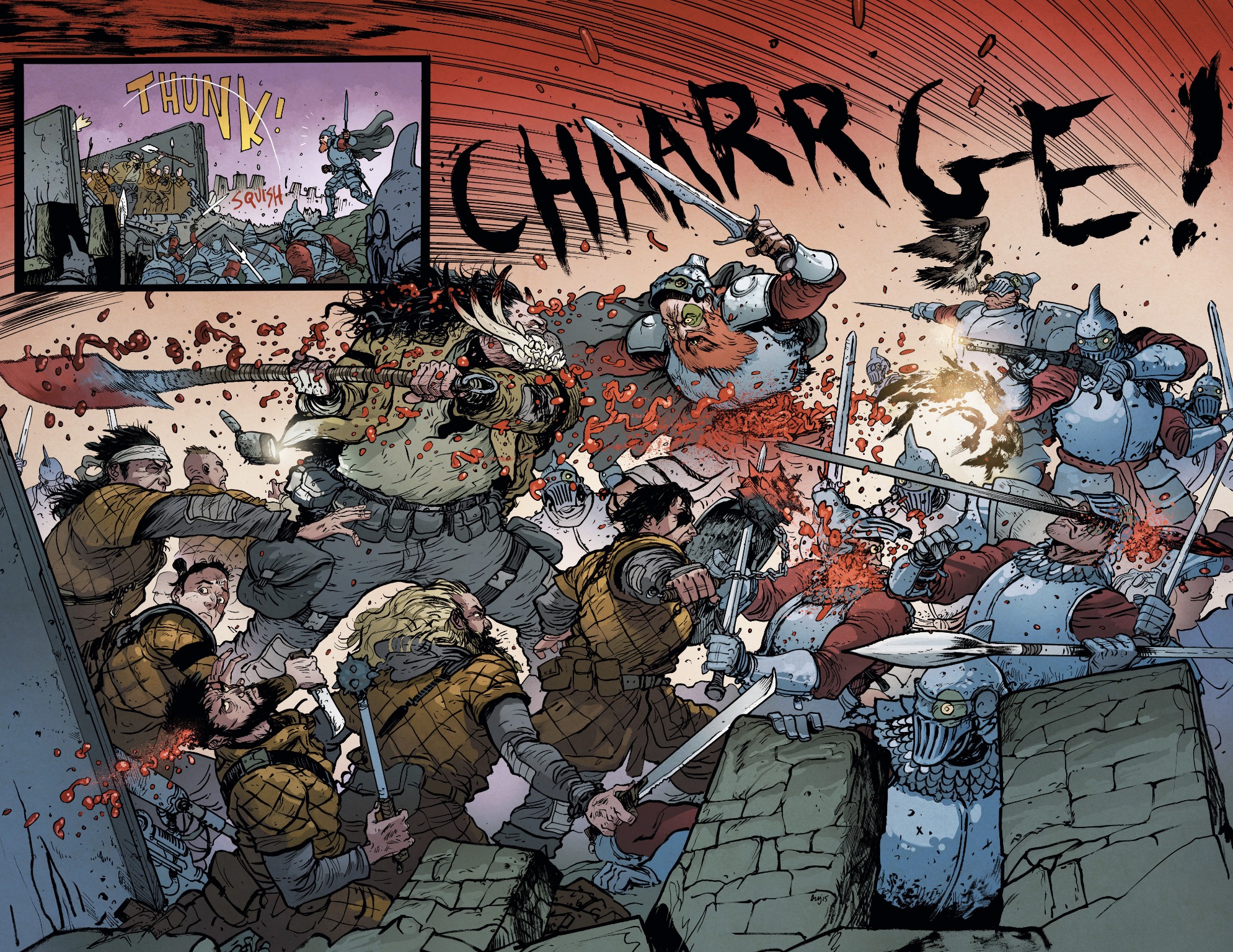 Ryan M: I am just as engaged by this first issue and though the tropes you identify are evident, the issue presents themes with a universal resonance. The dynamics of Thea’s family hew pretty close to stories that we’ve seen before, but Johnson is able to create a true sense of relationship between these characters. The bonds between father and child, brother and sister, and even husband and fallen wife are well-trod territory because they are somewhat elemental. Johnson creates moments that function both as plot points and character reveals. When Thea finds Rollo in an alley, afraid to fight, she allows her rage to power her to enact what is likely her first kill. Johnson gives us a moment with the siblings directly after.