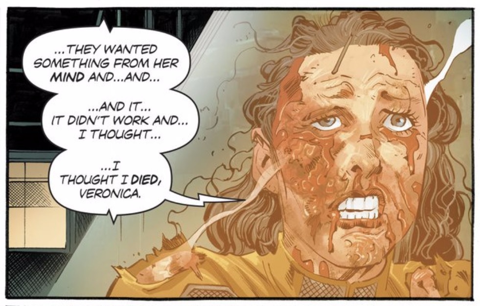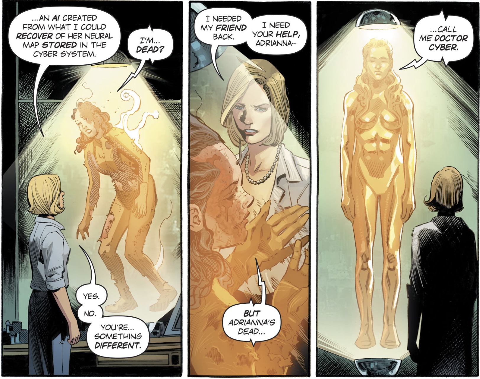 Of course Rucka establishes that this is not really Adrianna, but as close as Cale could get. It’s similarly eerie how Adrianna instantly accepts that she’s not who she believed she was and adopts the name “Dr. Cyber.” I suppose it makes sense that an artificial intelligence would react logically instead of emotionally, but it was still a surprising moment.