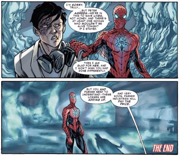 Spencer said he might not describe this issue as “grim,” but “dire” might be appropriate. Pete’s wealth, even when he’s charitable with it, isn’t a great look on Marvel’s every-man. Bobbi calls him out on this when he’s flying home on his private jet. “Don’t get all ‘one percent’ on me.” It comes up again later in the issue, also about flying: Bobbi asks why they have to fly a commercial airline to Hong Kong when they could just as easily take the private jet. It’s in the shop, so Bobbi jokes back: “Just have to settle for first class. Tough times.” I don’t really know what we’re supposed to take from these moments, but it does make it seem like Peter’s losing that ever-man quality. And on a personal note, that makes me like him less.