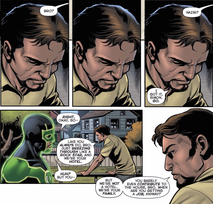 When you think about it, being a member of a galactic police force is a job, but it seems to be more of a volunteer-type thing. That is, most of the other Earth-based Lanterns we know keep up (or at least have historically kept up) day jobs, suggesting that it is possible, and maybe even necessary. Though I can also understand Simon’s position: being a Green Lantern is kind of a full-time job, even if he isn’t exactly being paid for it. Which is to say, I think the expectation that Simon contribute financially to his household is both totally reasonable and a huge ask. His responsibilities are in conflict, plain and simple.