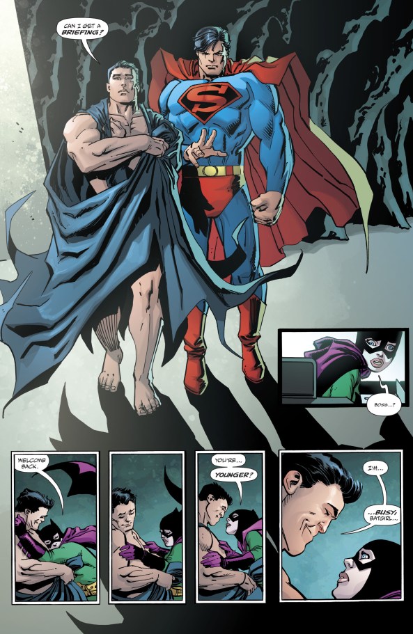 It should go without saying that this never-dying Batman was going to go on never dying, but I’m curious as to how Azzarello achieves this. Carrie believes Bruce is dead, morns for a beat then moves on — the soldier that her mentor trained her to be. Suddenly Superman returns with a very much living, younger Batman — revived by the Lazarus Pit.