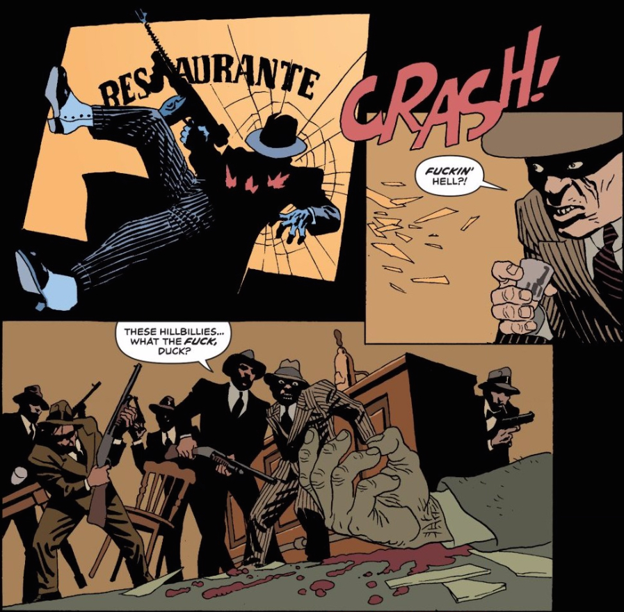 We don’t see human-form Lou Pirlo until the final panel of the issue. He wakes up naked, possibly dying, in Delia’s arms, and that’s the most we see of the man. The lead up to Lou’s appearance is one of those knock-down, drag-out confrontations readers would expect of the final issue in a story arc, but it’s so chaotically presented as to make any meaningful conclusion difficult to draw. Writer Brian Azzarello and artist Eduardo Risso have these two factions — the gangsters and the hillbillies — and Azzarello seems to love writing in their common tongue: profanity.