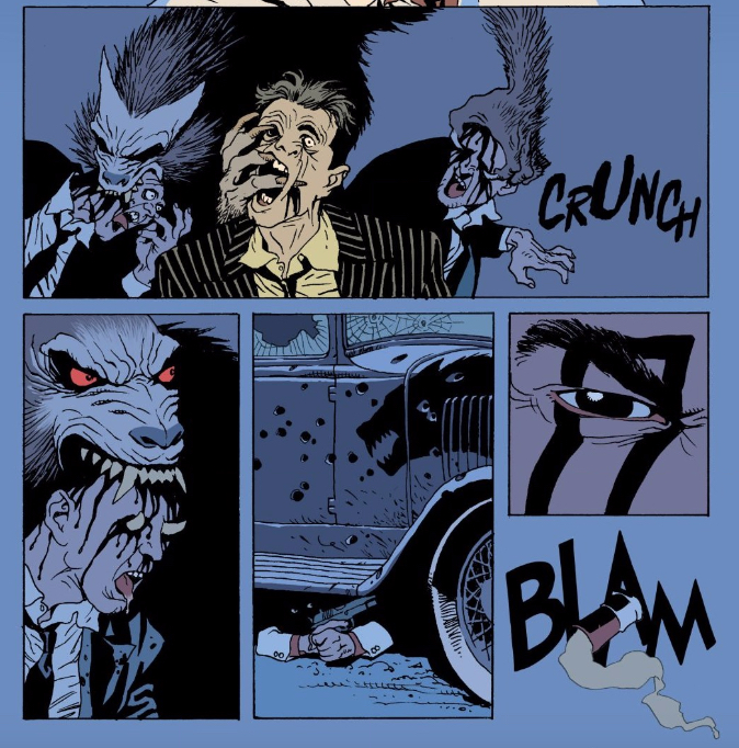 Patrick focused on the carnage (with good reason), but I’m more interested in those last three panels. We see one of the gangsters level his pistol at the werewolf, whose proximity we can glean from the shadow it casts over the car. In the next panel, we see an eye with a strange, rectangular shadow cast over it, followed by the “BLAM” of a gunshot, accompanied by a rifle shell.
