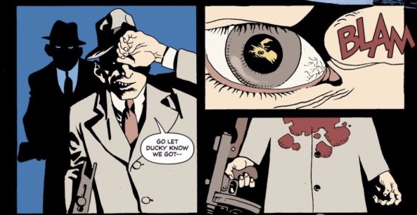 The reader can be forgiven for thinking the eye in the second panel was that of the gangster we saw in the first (though there’s no explanation for that shadow), but by the third panel, it’s clear that someone else fired at the monster. It’s only when we see the figure of the “angel-of-death,” as Patrick called him, that we understand that strange shadow as the one cast by his distinctive rifle sight. These are details that fly by in the excitement of this scene, but understanding them is essential to understanding exactly what happens. Azzarello and Risso could have introduced the angel-of-death earlier in the issue to make that sequence clearer, but they chose to hold him back to really goose the surprise of his arrival. It works beautifully, but only if the reader understands that every panel matters.