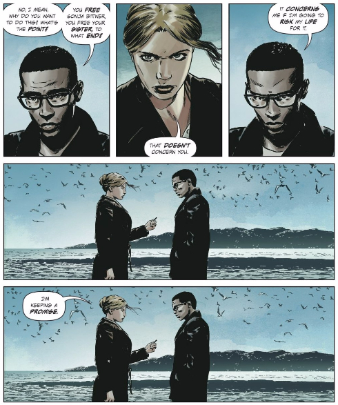Spencer: It’s always hard to tell with Johanna. It’s that unpredictability that makes her perhaps my favorite character in Lazarus — you never know what Johanna is thinking. In this particular situation, I tend to think that she’s being honest — or at least honest enough — when Michael presses her for her motive.