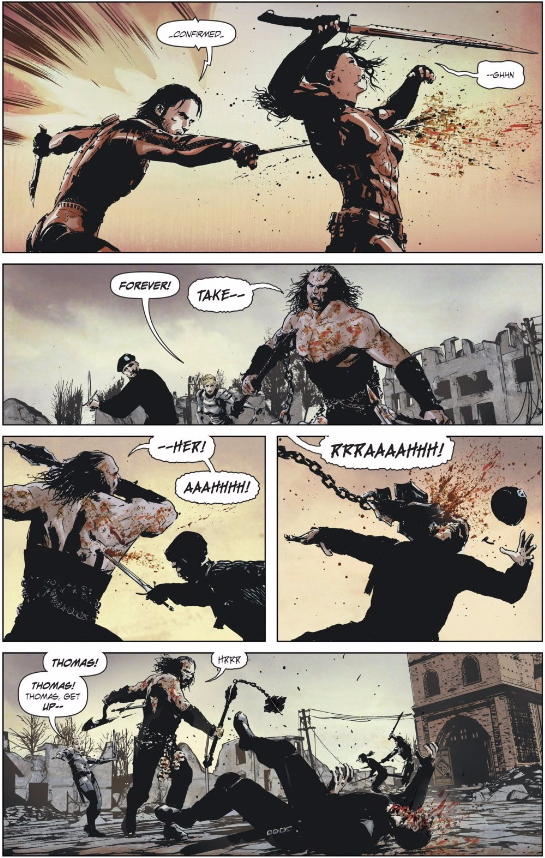 But the real delivery lies in just how devastating the battle is. While the fist half of the issue splits its attention between several threads, the back half unflinchingly details every crushing blow of this fight. Lark is unrivalled in his almost documentarian ability to convey violence, and this particular battle pushes him to his absolute limit, calling on both the detailed blow-by-blow approach he’s used in the lazari fights and the more scattershot approach he’s used to capture the chaos of an active warzone to craft a truly heart-stopping seven-page fight.