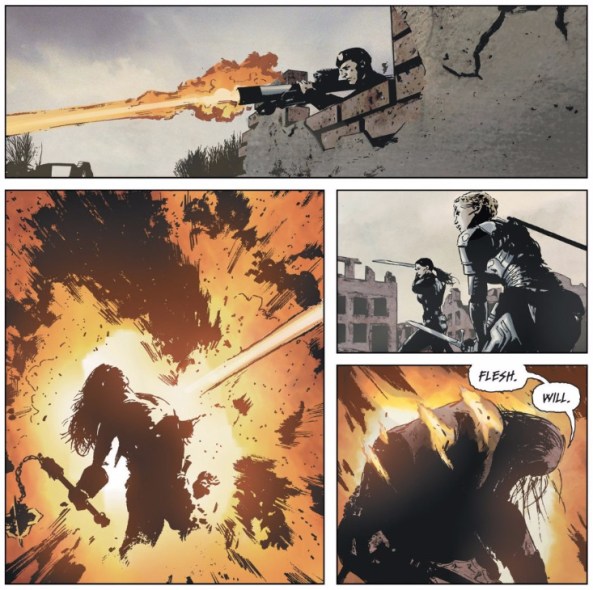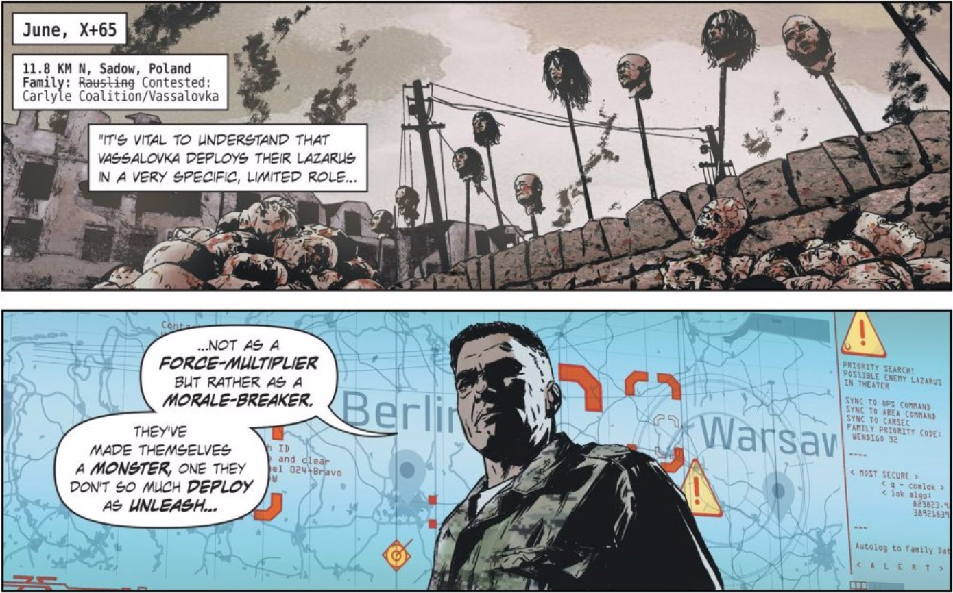Malcolm expresses later in the issue how this strategy creates the myth of Vassalovka’s monster, but we already understand exactly how it works — we’ve already bought into that myth. Whatever is wreaking this destruction on coalition forces and civilians alike has to be unlike anything we’ve seen before — there’s none of the courtly decorum we saw on display when, for example, Forever faced Sonja; just pure carnage.