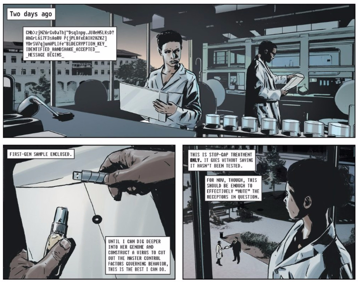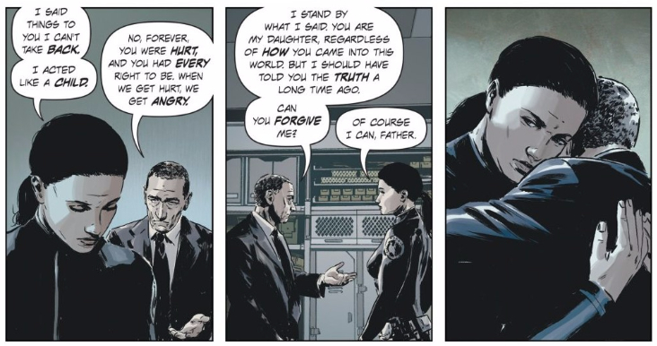 Forever’s expression in that third panel just kills me. She’s pretending to still be on her father’s side, but even while hugging him — an action that’s supposed to be intimate and affectionate — she can’t think of anything but what a lie it all is. This is mirrored later in the issue, when Jo fakes a hug in order to pass Forever Michael’s data. It’s yet another moment of affection with a family member turned into something far more sinister — and even though in this particular moment Jo’s helping Forever, I can’t help but wonder if it’s implying that, ultimately, she’s as much of a danger to Forever as Malcolm is.