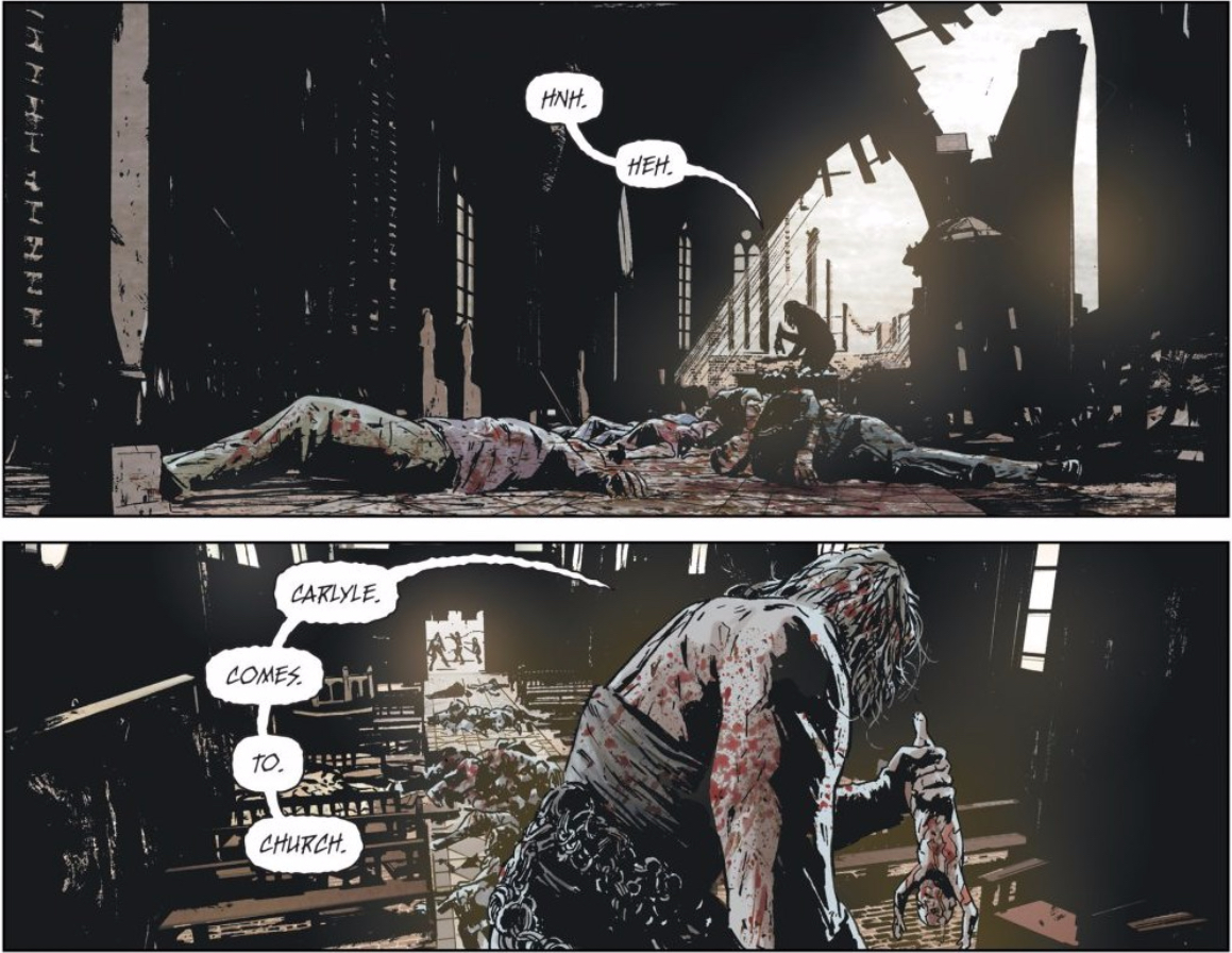 So when Johanna opts to send four lazari to face Zmey, we understand that he truly is a threat. We’re excited and terrified by the thought of this fight long before Sonja and Joacquim so dramatically throw open the church doors. Whatever image Rucka and Lark could put behind those doors had some serious expectations to live up to, and I think their hulking brute absentmindedly gripping the corpse of a dead baby absolutely fits the bill.