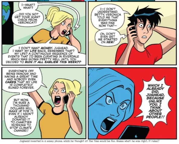 Ryan D: After five years of teaching high school, it became clear to me that I do not envy teenagers in this decade. Kids have an entirely new plane for making mistakes to which I was not privy in the early 2000s — one which revolves around the ubiquitous little pocket-computer everyone has now, coupled with unlimited internet access and an expectation to hold a social media presence. Technology is, in many ways, a blessing and provides opportunities beyond our dreams less than twenty years ago, back when the world-wide web pretty much just hosted cool websites like “HampsterDance,” but I can only imagine the trouble I would have gotten into if I were sixteen today. Jughead Jones finds himself in a predicament in issue fourteen, a very modern problem, and he just can’t seem to please everyone when the internet is involved.