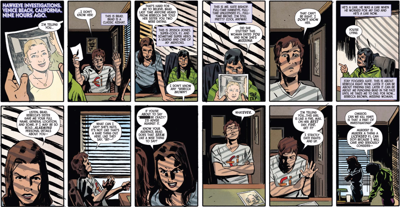 Jessica’s come to L.A. searching for a missing woman named Rebecca Brown, who was last seen with Brad, the “asshat” Kate’s been investigating due to his ties to her father. Kate is overjoyed, and possibly a bit starstruck, to be working with the woman who not only previously mentored her during her first stint with the Young Avengers, but who she considers a “legend” amongst P.I.s. Interestingly enough, though, Jessica treats Kate like an equal partner rather than a protégée, never talking down to Kate and trusting her to have her back (sure, Jessica’s still bossy and combative, but hey, she wouldn’t be Jessica Jones if she wasn’t). Instead, it’s Kate who feels like she has a lot to learn, and while she’s never angsty or self-deprecating about it, her insecurities about her new job do eventually come to light.