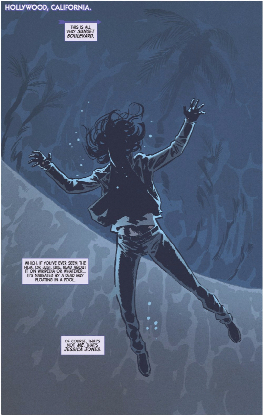 I think the other layer of the Sunset Boulevard reference comes from the ways that this book also parodies noir. I’ve compared this book from the beginning to Shane Black, and you can see a lot of Kiss Kiss Bang Bang in it (that ‘The Girl in the One Movie’ line reminds me of some of Kiss Kiss Bang Bang’s jokes about wannabe actresses). But the idea that ‘sometimes, the world lines up to your favourite noir movie, but the reality of the situation is never as romantic as the fiction we read’ is very Kiss Kiss Bang Bang. Yeah, we have Jessica Jones floating in the pool, but in reality, it is just a single moment of time in an action sequence, and takes place in a case that involves stuff where Kate and Jessica spend three hours in a closet, talking about how unprofessional PI work actually is, and the Jessica Jones tips include Stakeouts are Boring and #%!@!!!. The fact that sometimes reality collides with the fantasy doesn’t not change the fact that in real life, the story is much different. Shane Black knows this, and Kate Bishop, avid movie buff, is constantly wrestling with this fact throughout this book.