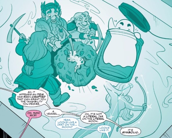 The joke in the panels above is that it’s ridiculous for this dwarf to be calling 911 in this instance. This is continually reinforced by his listing off of all the things happening in the battle behind him in a very literal way. Instead of simply saying “Ghostrider” is in my backyard he describes the flaming car and so on. The point of this joke is to point out how absurd the whole situation is and thereby make us laugh at how absurd comics are in general. That’s not a bad idea, but I don’t need the authors of this book telling me that this situation is absurd in the first place. That fact should either be apparent enough in the first place OR the authors should trust the audience to recognize that and not spell out for them.