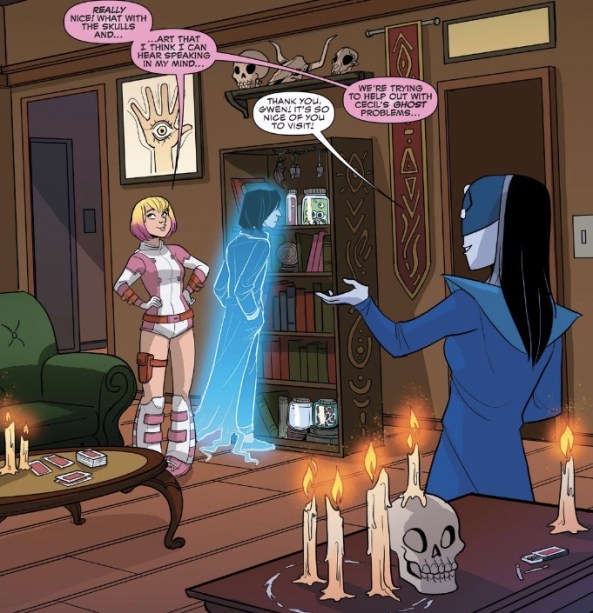 Gwen is on a mission to help her friend Cecil, a ghost, regain his corporeal traits so he can once again interact with the physical world. She visits another friend, Sarah, who happens to be a witch hoping that she can help her and Cecil out. This leads Cecil and Gwen on a wild goose chase wherein they meet Ghostrider, Hawkeye (the girl one), and a bunch of miscreant dwarves. Predictably, this leads to chaos in the third degree.