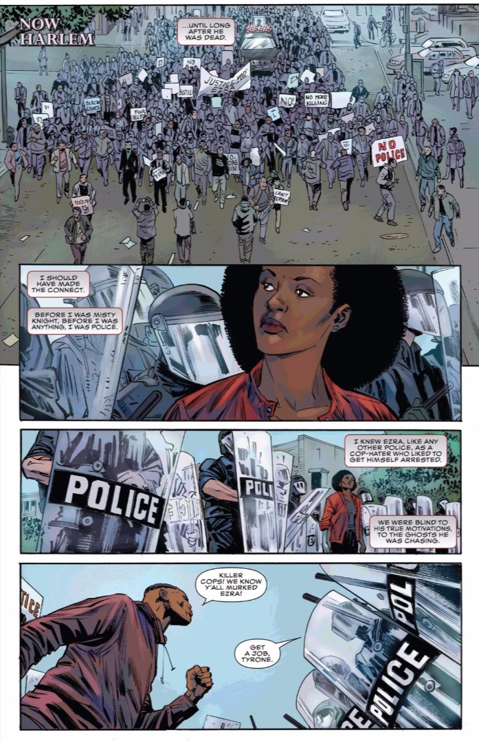 After all, she’s a superhero but also a detective; she’s a cop, but also a black woman raised on the same streets she’s now protecting. Misty should have a perfectly balanced view of the situation at hand, but is, unfortunately, blinded by her devotion to the police. Notably, Misty throws both their union and her case’s victim under the bus when she asks the prison guard for information, instead insisting that they need to finish the job simply to honor their roles as police. Misty spends much of the issue pointing out in her internal monologue how suspicious the handling of this case — the sudden death of activist and “cop-hater” Ezra Keith while in police custody — is and how it’s destabilizing Harlem, yet when approached by Keith’s nephew, nearly dismisses them entirely because of one anti-cop sentiment.