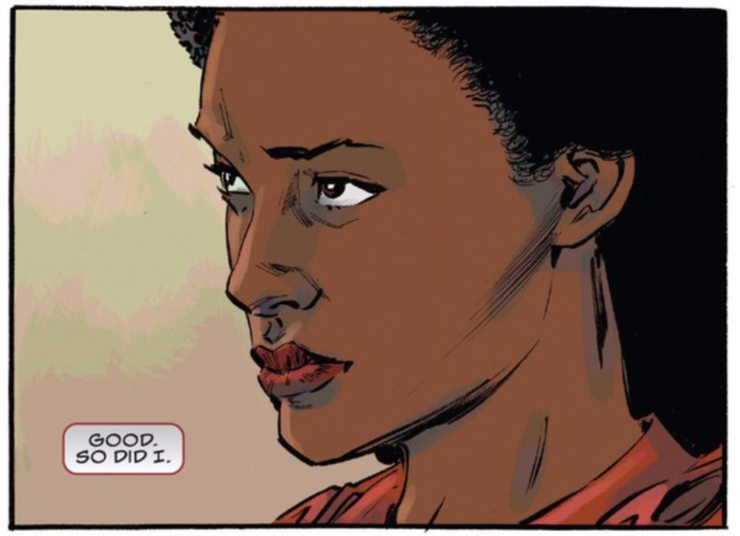 To begin with, I think that Guice’s visual storytelling already pairs extremely well with Coates’ narrative style. Knowing the writer, there will be “talky” scenes- especially in this opening issue in which the world needs to be established for the reader, and so that the audience understands each character’s rhetoric/dialectical stance so that the story can progress accordingly- but we already see how Guice keeps the camera moving with obvious intent to keep the eye interested in what could be a visually static scene, highlighting certain key images. I feel like this intent displays itself very clearly as Misty catches up with her old…friend: