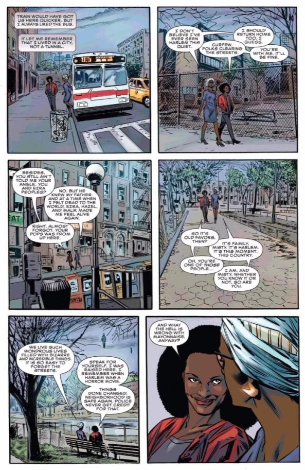 Because yeah, misty wrestling with her loyalty to her old profession and the understanding of what is really happening is compelling. I love how it manifests both in obvious ways, and in her discussions about artisanal mayonnaise. And I love that it doesn’t find a simple answer, but acknowledges the complexities of the topic (‘I like mayonaisse, Misty. In doses’ says Storm). While also making sure that the things that need to be obvious are obvious – the Americops, Marvel’s walking metaphor for racist policing, attack Misty for drawing a very clearly holstered weapon.