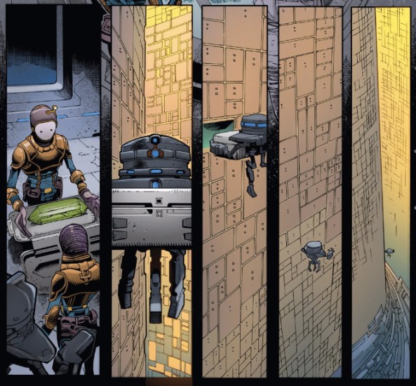 Aboard the Citadel of Rur, Dr. Aphra and her father are about to be buried in the collapsing ruins of an ancient Jedi civilization. Right from the jump, “history” is the threat. Personifying that threat (or roboticizing it anyway) is the non-corporeal robot-haunting conscious of The Immortal Rur. Rur can essentially possess any of the machines in the citadel, effectively turning the whole relic against our heroes. I said above that Aphra has no reverence for history, but that shouldn’t suggest that the subject doesn’t interest her. In exchange for the current date, Aphra gets Rur’s story. And it’s a complex story about artificial intelligence the providence of original consciousness, told in busy flashback panels.