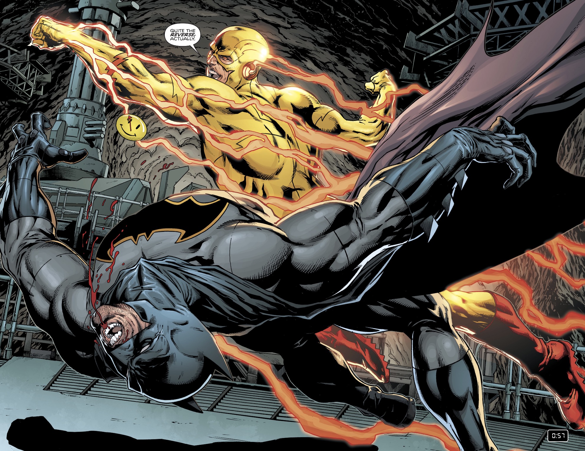 When Batman is able to strike back a few pages later, the timer makes it clear that he can’t match Reverse Flash’s pps, maxing out at about one: