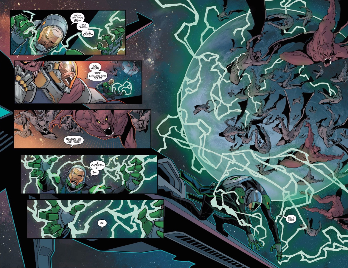 Of course, the pressure of the situation is a proving ground for basically all of the characters. Both Medusa and Gorgon cast their medical conditions aside to help. Black Bolt, meanwhile, cowers from the fight, which tips Medusa off that this isn’t Black Bolt, at all. That Maximus the Mad had faked his way on board opens up a whole slew of questions, from where the real Black Bolt is (presumably on Earth, but in what condition?) to whether that figure from the future we’ve assumed is Black Bolt might actually be Maximus. That’s a twist that might have more immediate impact than last month’s, which functionally just gave Medusa a haircut. I’m certainly excited to see where it goes next.