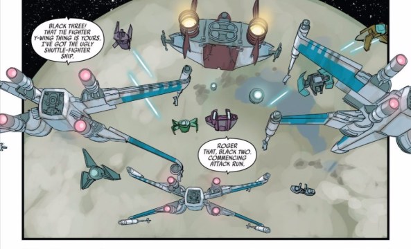 The thing that stands out about this issue is Phil Noto’s artwork. He stages the Black Squadron X-Wings flying into action from outside the panels in the gutters, as if they’re an omnipresent force.