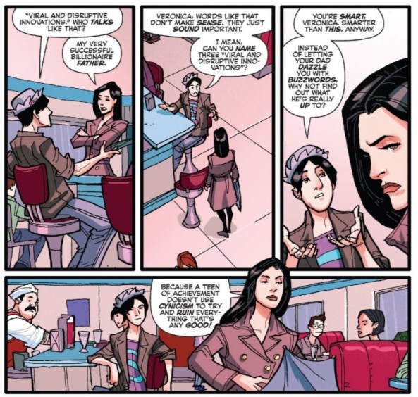 Patrick: I’m not really sure how to classify Jughead as a character. He’s like some kind of invincible, infallible spirit, far enough removed from the drama to not be overwhelmed by it, but still incredibly perceptive. I’d be tempted to call it a narrative cheat, but he stands as a necessary foil to Archie’s aching sincerity. It turns out that Jughead’s sprightly insights can cut through more than just the complicated knots of teenage romance. Archie 19 finds Veronica in need of the same kind of detached, magical advice, but this time to free herself from machinations of her own father. And in so doing, Juggy might just open himself up to feel something of his own.