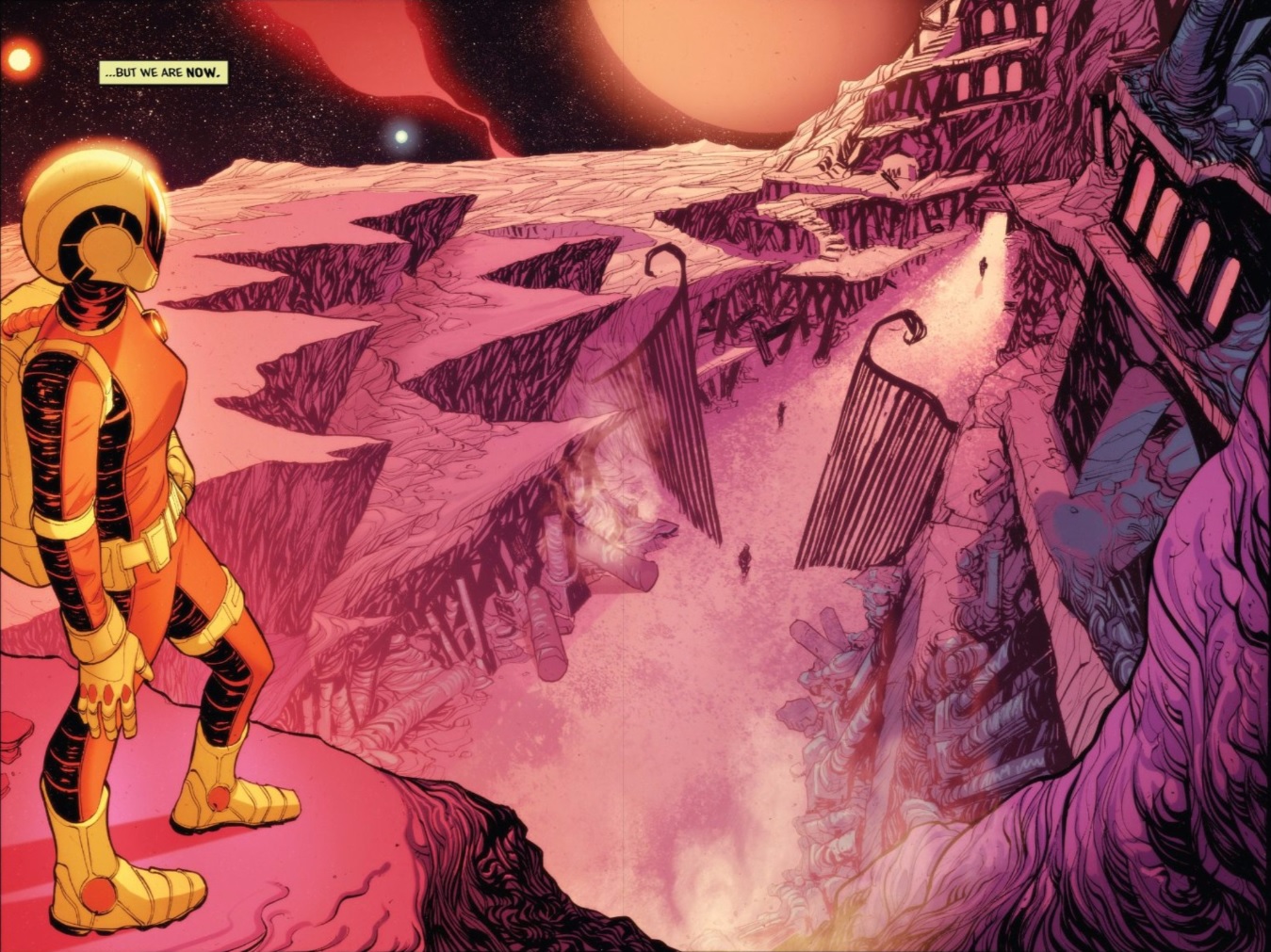 The mix of the familiar (i.e. gates and architecture) with the strange (an alien landscape featuring an atmosphere unfriendly to human consumption) strikes home while quickly forcing the reader to ask the next logical question: if there was life concurrent with us, then what happened? The comic is ready to take us on that journey, but first it must establish how we’ll do that, and who it is doing it.