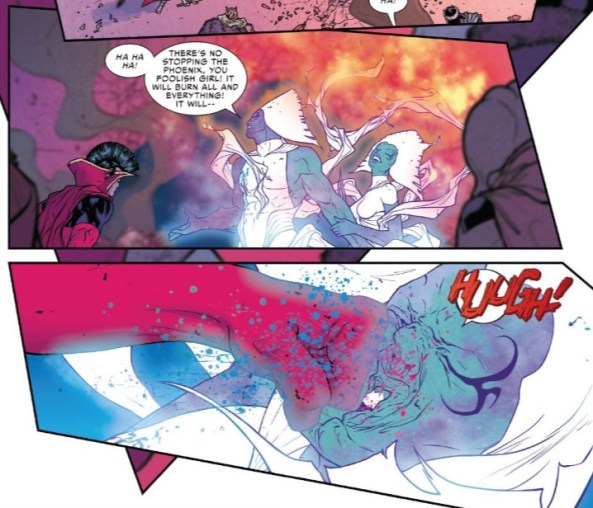 Er, “villain” might be the wrong word for the Phoenix, which acts more as a force of nature than a sentient being, but that’s totally fine, since this issue treats it more like an idea than a physical entity. That starts from the very first scene, which even undermines its own reveal of the yet-unseen Phoenix, forcing Quentin Quire to double back to even catch that it was mentioned.