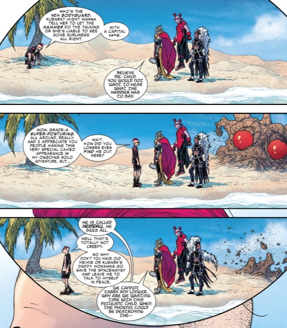 And the best thing is that this unique way of constantly surprising us doesn’t mean the underlying dramatics aren’t strong. Jane winning because she managed to inspire Gods to her defence. The Shi’ar rejecting their gods. The gods summoning the Phoenix out of spite. So much good stuff, complete with the always fantastic art. We still don’t know Quentin Quire and Odinson’s exact purpose in the plot, but that’s part fo the fun.