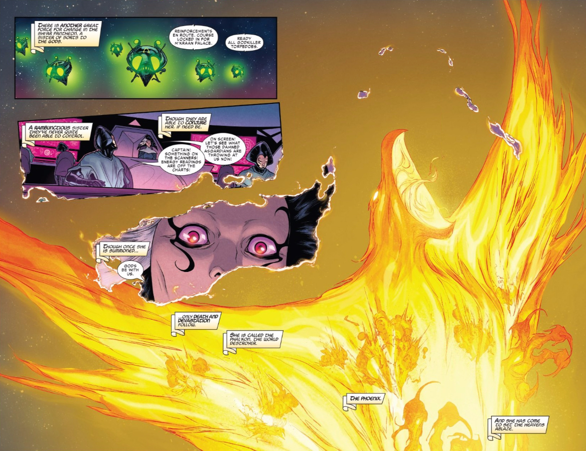 Structurally, that completely undermines whatever surprise this reveal could have garnered. We see the Phoenix the second we turn the page — those three panels that then build up to it are only building up to what we’ve already seen. But of course, we already knew it, anyway. In introducing the idea of the Phoenix at the start of the issue, Aaron and Dauterman completely free themselves of having to surprise us here. Its arrival can’t shock us, so it should at least be pretty. And it totally is — this thing almost hurts to look at, Wilson’s lighting effects are so dazzling.