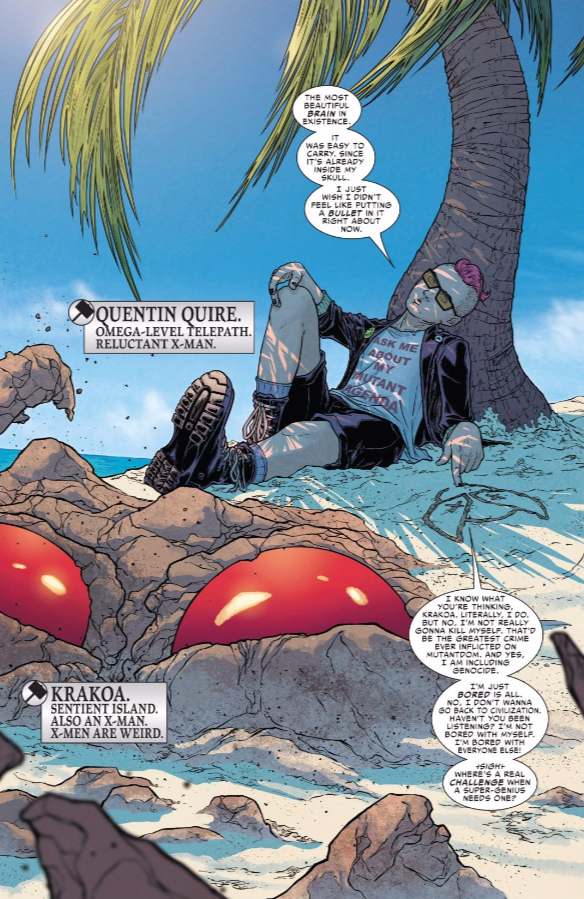 I can’t imagine anything more Quentin Quire-y than absentmindedly doodling a dead wolverine while wearing an “ask me about my mutant agenda” t-shirt. He’s riffing on recent Marvel continuity and publications in a way that only a character created by Grant Morrison can. Heck, even the chyrons get a little meta, commenting on how weird it is that Krakoa is an X-Man.