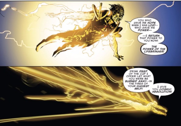 With that in mind, it feels appropriate that the Ultimates’ first major victory against the First Firmament is achieved through the most human methods possible. Spectrum and Blue Marvel’s deep understanding of each other allows them to combine their bodies and strength; The Troubleshooters call on an old friend for help; Anti-Man sacrifices his very life to free Galactus from Logos’ curse.