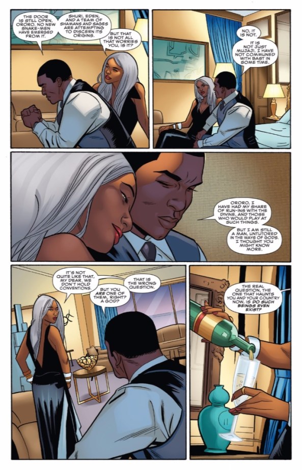 Black Panther: I praised Black Panther and the Crew for how it combined Coates’ strong thematics to a more typical story that he has a better handle on. He seems to be doing something similar here. Snake people are coming through a portal in waves is very typical, but provides structure for Coates that a complex, three faction rebellion doesn’t. You just do what you always do, but in the scenes where the characters go off to research the threat, you can have a discussion with Ororo about godhood instead of exposition. Add to the fact that Coates is rebuilding the T’Challa/Ororo relationship, giving the scene intimacy to go alongside the deep, thematic discussion, and you have Coates in a more comfortable position. Even so, there is still a lot to learn