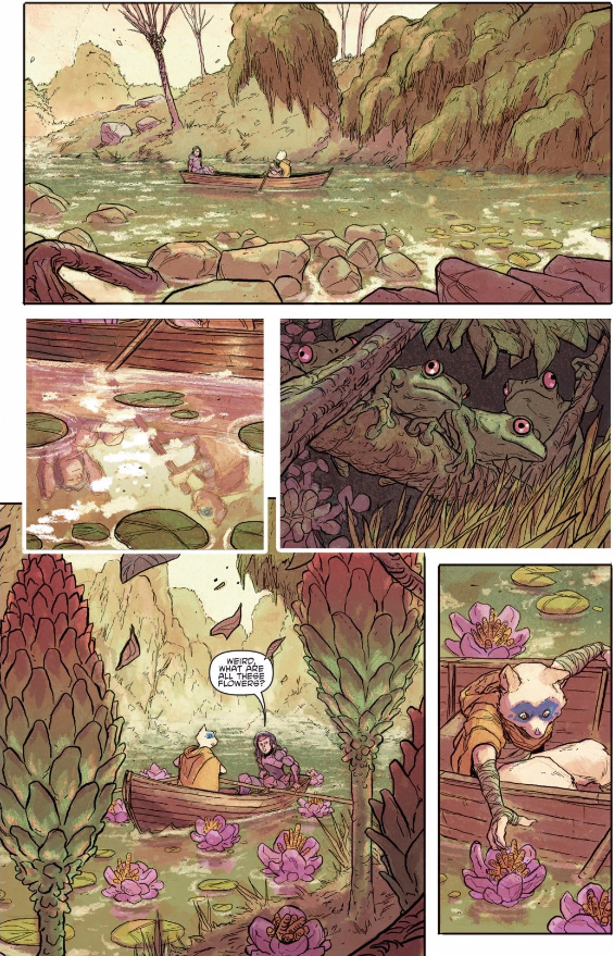 Tunica quietly subverts a handful of storytelling best-practices, giving the pacing of the issue a funky gait every time we’re supposed to be asking the question “hey, wait, what’s going on here?” A lot of his pages end with panels bleeding into the gutters on the bottom and/or right side of the page — a common technique to encourage the reader’s eye forward. But there are a number of times Tunica reverses this, pulling the reader’s eye down and to the left. It is beautifully irregular, and paired with Toad Baron’s endless dance party, suggests a waltz-y weirdness that couldn’t be accomplished by Miyazaki-esque designs alone. Here’s an example: Alopex and Angel discover some… oddly proportioned flowers in the lake. Tunica tags it with one of these awkward, leftward footsteps.