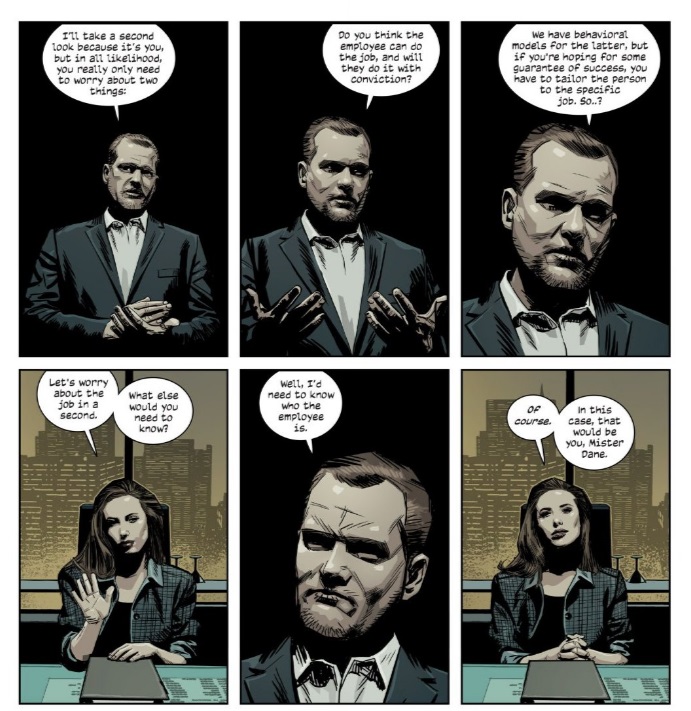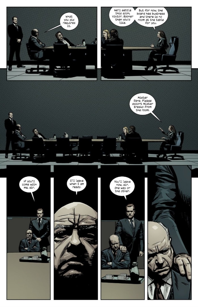 Just like in the scene of Dane’s almost-suicide, Coker sets the readers’ eyes up for a wonderful journey which tells just as much of a story as the words on the page. The first two panels at the top seem purposefully separate so that we intuit the two camps in the room: Marko and Viktor on one side (with Dane standing there, guardedly, forshadowing his function soon) opposing Ria, alone on an island of an office chair. Her next speech balloon pulls our eyes down before the uncomfortably long, awkward journey across the board room table to Viktor. Then we go down to the physical confrontation in the bottom four panels which carries its own cadence, and the camera pulls in tighter to ratchet up the tension — appropriate because the conflict here is one being played through the disregard of personal physical boundaries.