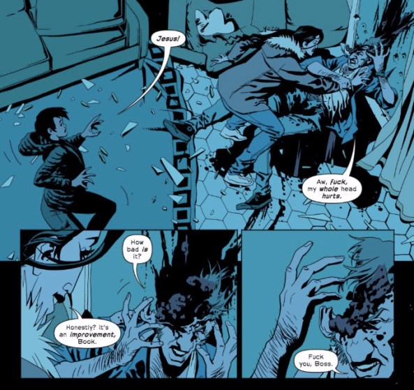 First on the somehow-even-more-cynical side: Booker. When the issue starts (and, indeed, when the previous issue ended) it almost seemed like the character was finally dead. Artist Leandro Fernández leans into the grizzliness of the wounds that would lead both the reader and Andy to this assumption.