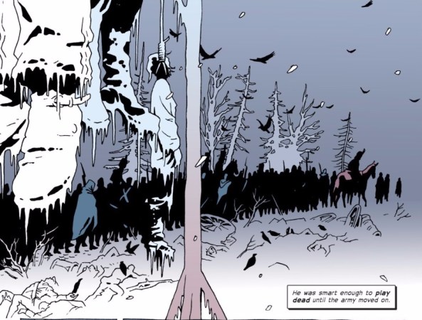 I think my favorite portion of The Old Guard 3 is Booker’s backstory — in particular the way he died. Leonardo Fernandez creates a desolate winter landscape as the French troops march away from Booker’s hanging “corpse.” The snow covers the panel, with a few differentiating textures from Daniela Miwa. Other than Fernandez’s inks of the troops, crows and outlines of trees and buried bodies, it’s all snow. The white of the snow is an overpowering force that takes over everything in its path.