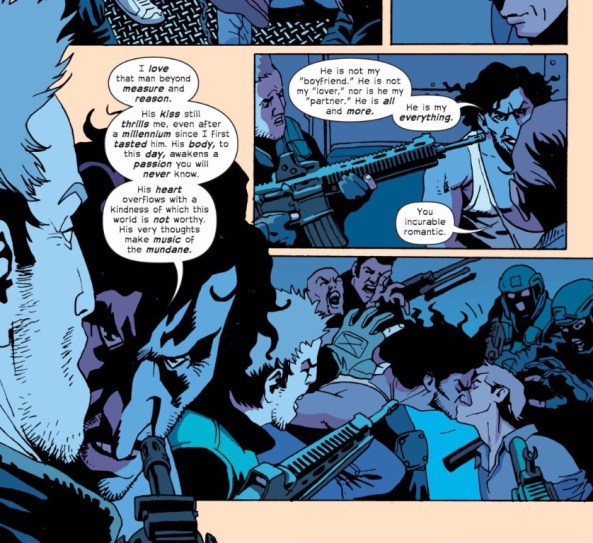 The palate cleanser for all of this doom and gloom is Joe and Nicky. I’ve been singing Fernández’ praises for the majority of this piece, but Joe and Nicky’s relationship is expressed powerfully through Rucka’s written word. I think we all know what these sorts of expressions of love normally look like: a kind of “you complete me” cheesiness that feels both false and inadequate in the same breath. Joe’s soliloquy manages to embody the series’ crusty, antagonistic aesthetic while being the most sincere beautiful thing I’ve read in a long time. Most importantly, his speech plays as a consequence of immortality, suggesting that there is more than endless heartache in this equation. There is strength and love and bravery. Plus, Joe and Nicky can freak out their captors which a passionate kiss… before, y’know, murdering all of them.