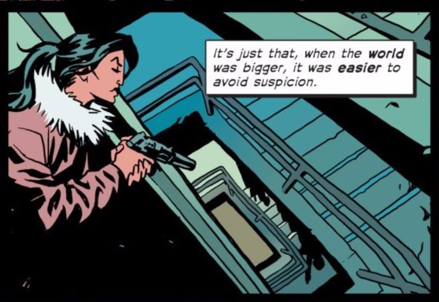 That’s sort of Booker’s original sin: extremely anti-social behavior. We’ll loop back around to his slightly-more-modern backstory later in the issue, but it’s crucial that the narrative moves away from this theme for the mid-portion. Up until this point, writer Greg Rucka appears to be making the case that an endless life leads to endless suffering. Rucka and Fernández are all to eager to bring that same suffering and violence right up to the present as Andy takes out a whole squad of Copley’s goons. The whole sequence is scored with unpleasant shit — from the micro betrayal of the old woman that rats her out to the macro betrayal of Copley turning our heroes in. Not even Andy’s heroics are allowed to be graceful as she storms down the stairs amid a hail of bullets and explosions. Fernández makes this sequence as chaotic and gnarly as possible, crowding the page with violent sound effects and messy motion lines.