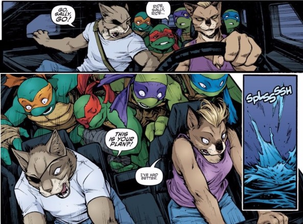 The two above panels happen at different points of the chase scene but are so charming I had to include both here. At top, when the Turtles first pile into Sally’s car Raph is mellow as can be, and ventures to even let out a song. Later, as their escape vehicle plunges off a bridge, Raph is nuzzled up to Michelangelo like content cat. There’s no critical reason I can give for wanting to highlight this aspect of the issue except for the fact that it makes my heart laugh. In a way, this demeanor suits Raph: almost like we’re seeing who he really is when his guard is down.