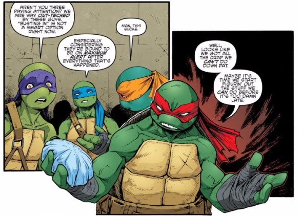 That guard comes back up later in the issue when the drugs wear-off. As the turtles are discussing their next moves, Donatello urges caution, given their inability to counter the manpower and tech the Agent Bishop has at his disposal. Back to his normal, grumpy self, Raph chimes in with his two cents.