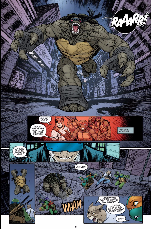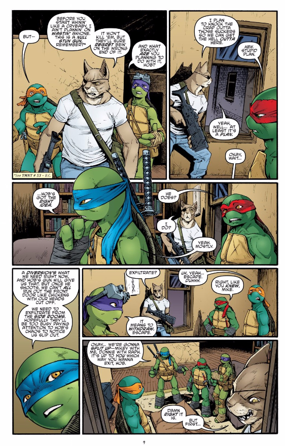 That actually leads me back to the writing in this issue, which is superb. We tend to praise the character work and the tight and intricate plotting of TMNT, but we’re seldom in the trenches praising the moment-to-moment writing. The plotting here remains great, but issue makes a case for Tom Waltz’ strengths as a scriptwriter. He’s absolutely on-point with the balance between quips and tactical banter during the Turtles “exfiltration.” Every line of dialogue is perfectly motivated by character and circumstance, and you sorta have to marvel at how holistically these five personalities play off of each other.