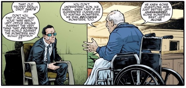 But I think the really valuable writing comes earlier in the issue, during Bishop’s visit with his old man. Taylor’s right to suggest that this is a pretty huge mythological revelation, but it’s also laying the groundwork for some awesome thematic stuff, too. Papa Bishop isn’t just revealing that these monsters have been around for decades, he’s suggesting that better, braver men than his son had made the decision to leave them alone. Pops lays every known military superlative at Eisenhower’s feet — warhorse, war hero, etc. — and even descends into state where he can only pitifully utter “I like Ike.” Eisenhower here represents the measured, experienced response. That applies both to his fear of the military industrial complex (real and namechecked in this issue) or addressing the Mutant Problem (fictional). Eisenhower had the perspective to speak clearly and logically about these things, but that’s a perspective that’s not easy — or, more frighteningly, not possible — to impart to people currently in power.