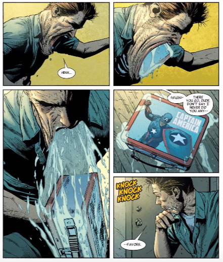 And that lie breeds distrust (and fear!) of people who are different. Case in point: Jason’s brother Brian has superpowers. Of course, since this is Nick Spencer we’re talking about, Brian’s powers are demonstrated by Brian barfing up a shiny new Captain America lunchbox, despite the fact that he was muttering “Captain… Fascist…” to himself earlier that morning. McNiven wants us to see how fucking gross this is.